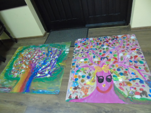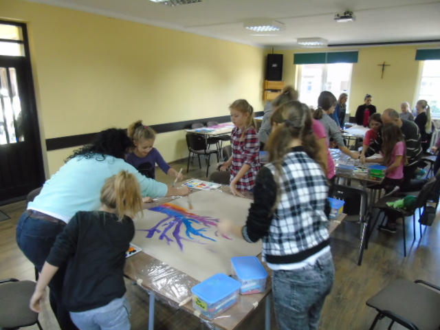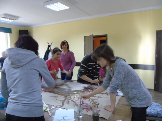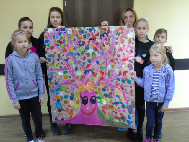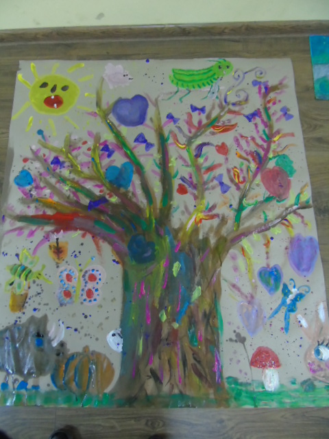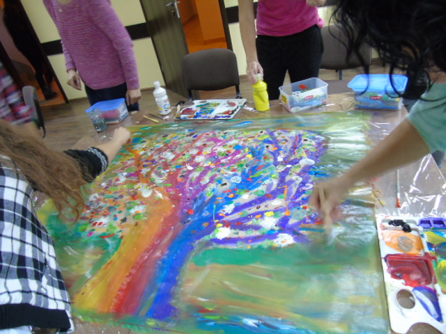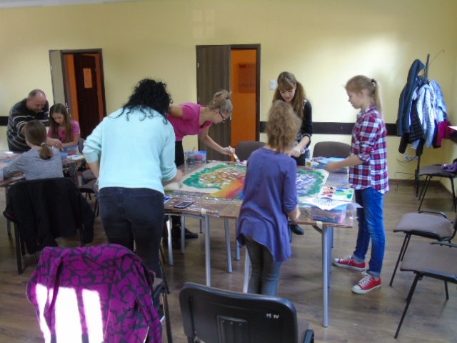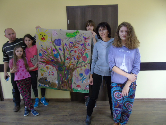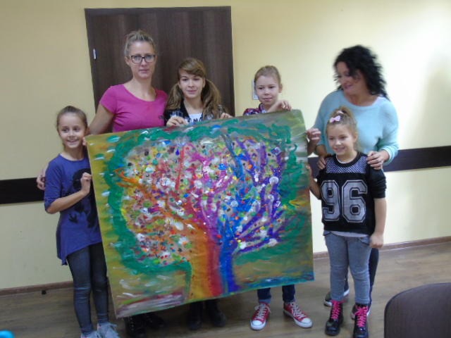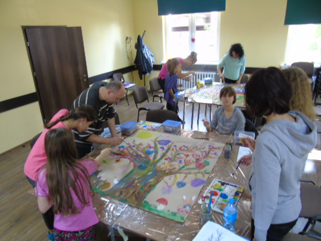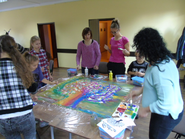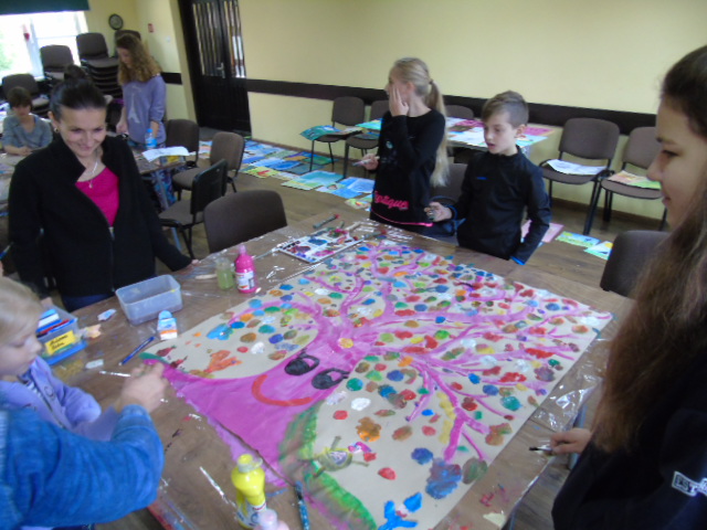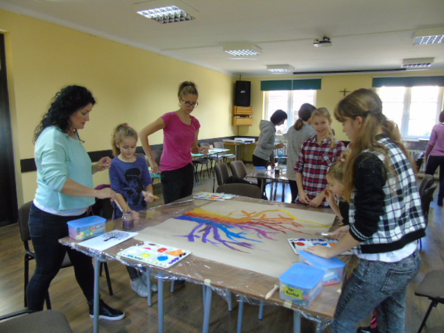 Celem wspólnych warsztatów było wykorzystanie umiejętności artystycznych dzieci i rodziców w tworzeniu malowniczego obrazu, którego poszczególne elementy tworzyły poszczególne osoby.