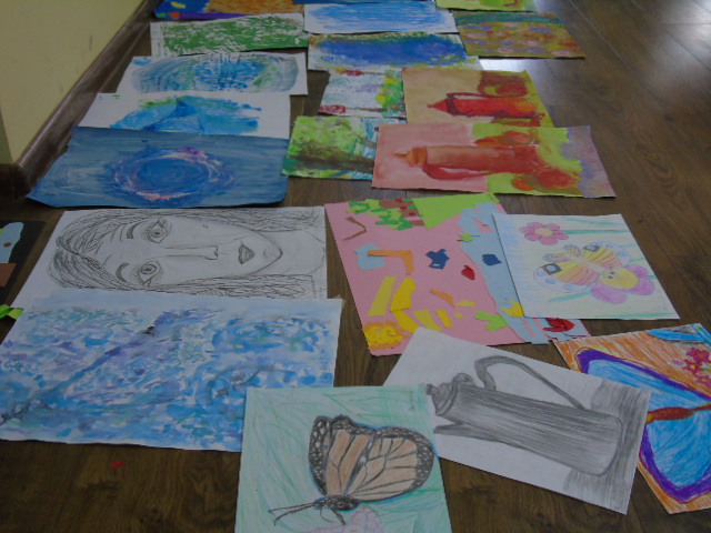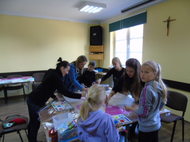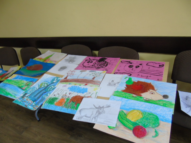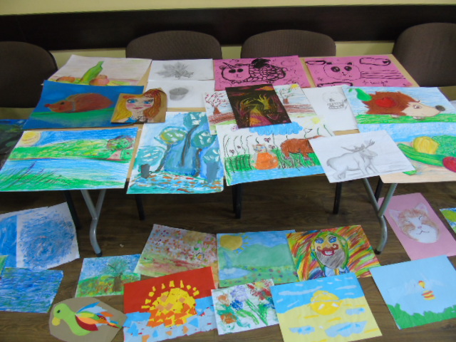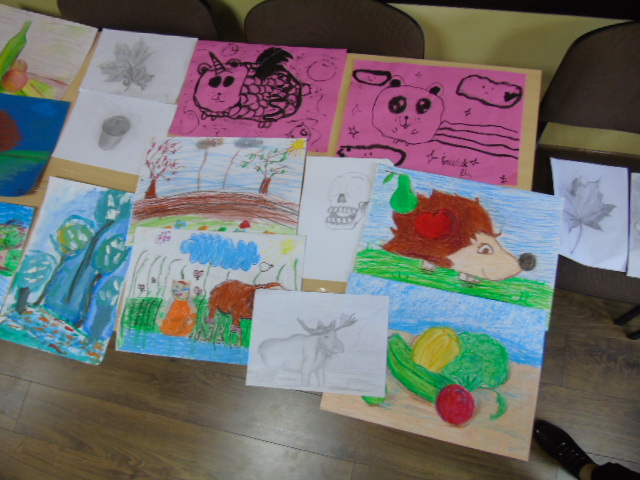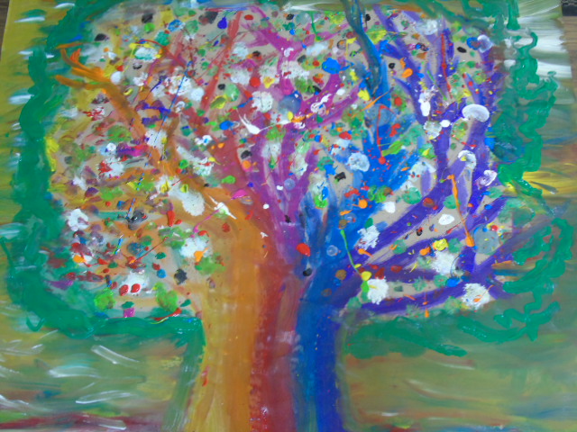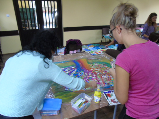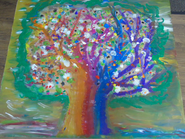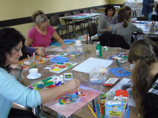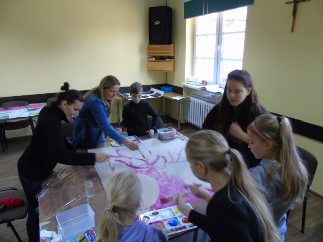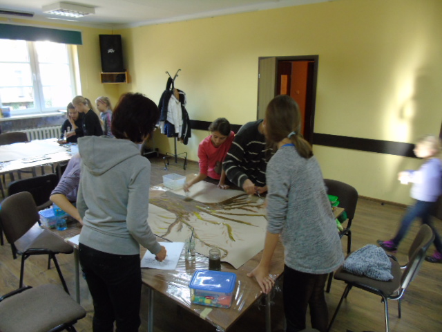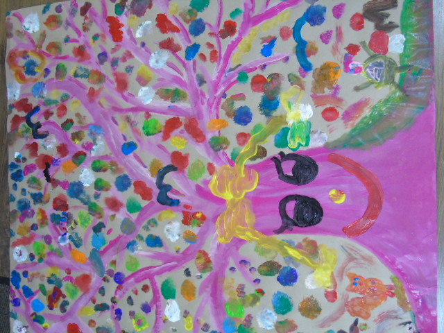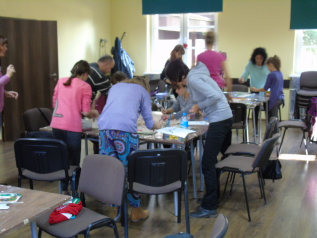Celem wspólnych warsztatów było wykorzystanie umiejętności artystycznych dzieci i rodziców w tworzeniu malowniczego obrazu, którego poszczególne elementy tworzyły poszczególne osoby.